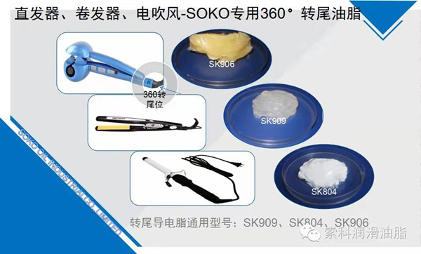 索科SOKO轉(zhuǎn)尾油脂專為直發(fā)器/卷發(fā)器360度無死角長(zhǎng)效應(yīng)用,有效減少磨損,對(duì)塑膠及貴金屬無化學(xué)反應(yīng),索科SOKO專用轉(zhuǎn)尾油脂SK909 和SK908系列/電源線轉(zhuǎn)動(dòng)部位接點(diǎn)潤(rùn)滑油廣泛應(yīng)用于各大國(guó)際知名品牌廠的直發(fā)器、自動(dòng)卷發(fā)神器中。