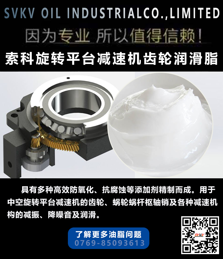 索科中空旋轉(zhuǎn)平臺(tái)交叉滾子軸承潤(rùn)滑脂 是由全合成油和獨(dú)特的添加劑制成,具有強(qiáng)韌的油膜,生成的潤(rùn)滑油膜可在軸承運(yùn)行中持久有效地保持軸承內(nèi)部摩擦表面的分離,確保軸承少磨損甚至無(wú)磨損地運(yùn)行。用于中空旋轉(zhuǎn)平臺(tái)減速機(jī)交叉滾子軸承使用。適應(yīng)性好,具有高低溫性能,南北方通用;啟動(dòng)力矩小,運(yùn)轉(zhuǎn)力矩低,功耗少,溫升低;優(yōu)異的重載潤(rùn)滑能力,優(yōu)異的熱穩(wěn)定性和機(jī)械穩(wěn)定性;可用于耐沖擊負(fù)荷及磨損,具有良好的防銹作用;可用于防止振動(dòng),擺動(dòng)腐蝕及延長(zhǎng)潤(rùn)滑周期;抗老化能力強(qiáng),可提高機(jī)械因連續(xù)運(yùn)行安全可靠性。