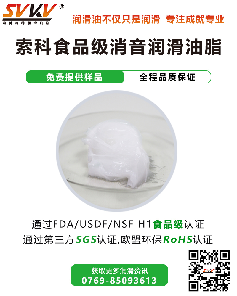 索科SVKV食品級(jí)消音潤(rùn)滑脂符合美國(guó)FDA和USDA的法規(guī)標(biāo)準(zhǔn),并通過(guò)美國(guó)USDA/NSF H-1食品級(jí)認(rèn)證,保障食品安全。