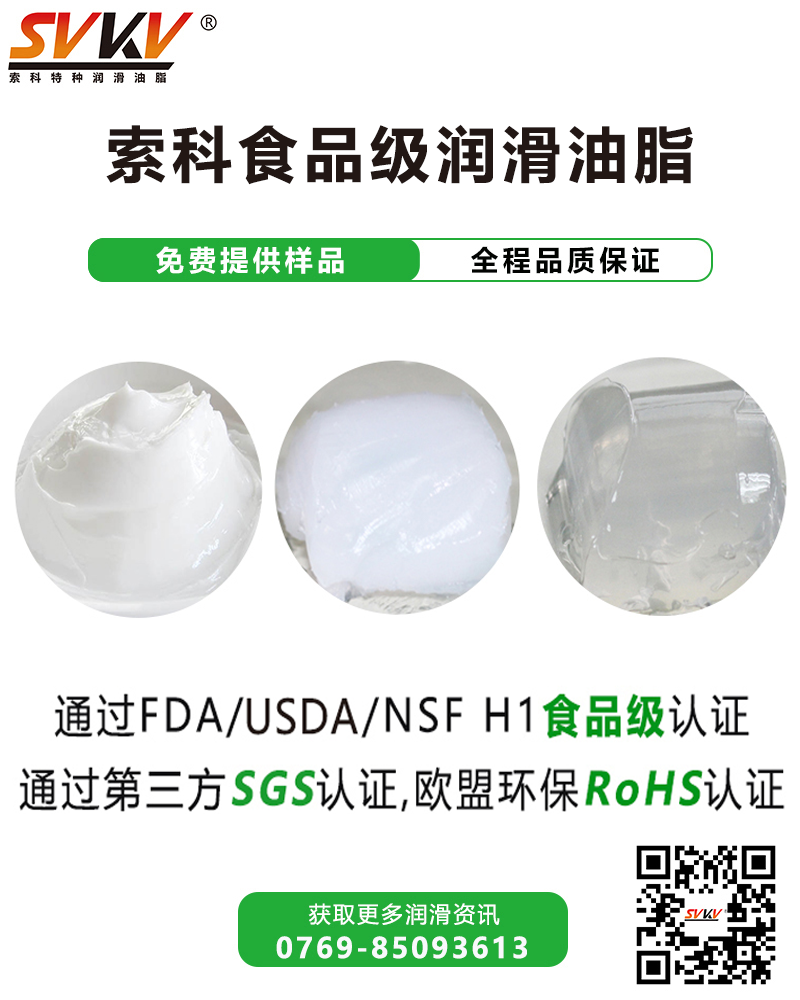 索科SVKV系列食品級潤滑油脂符合美國FDA和USDA的法規(guī)標準,并通過NSF H-1食品級認證,保障食品安全。