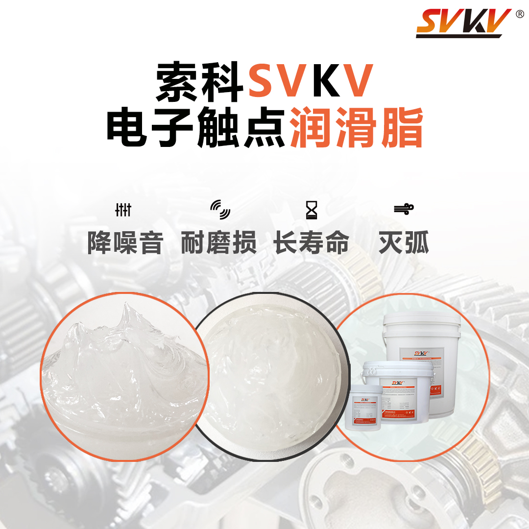 索科SVKV SK906系列電子觸點潤滑脂由無機皂稠化非矽酮類合成油加超導電添加劑?抗氧化劑等精煉而成。可以降低摩擦力,提高電流通過開關和連接露金屬界面的電子性能,在點閉合時形成超薄膜層的油膜,由于“量子賦道效應”電流可以很順暢通地流過,而斷開后變成厚膜時的觸點潤滑脂是絕緣的,可以防止漏電。唯能產品主要用于保護開關或連接器中護金及其它貴金屬表面不受外界條件的侵蝕。此潤滑保護劑可以在金屬表面形成一層保護膜,這層薄膜可以減少接觸磨損,防潮、防腐蝕、防鹽霧,穩(wěn)定接觸電阻和增強導電性能。