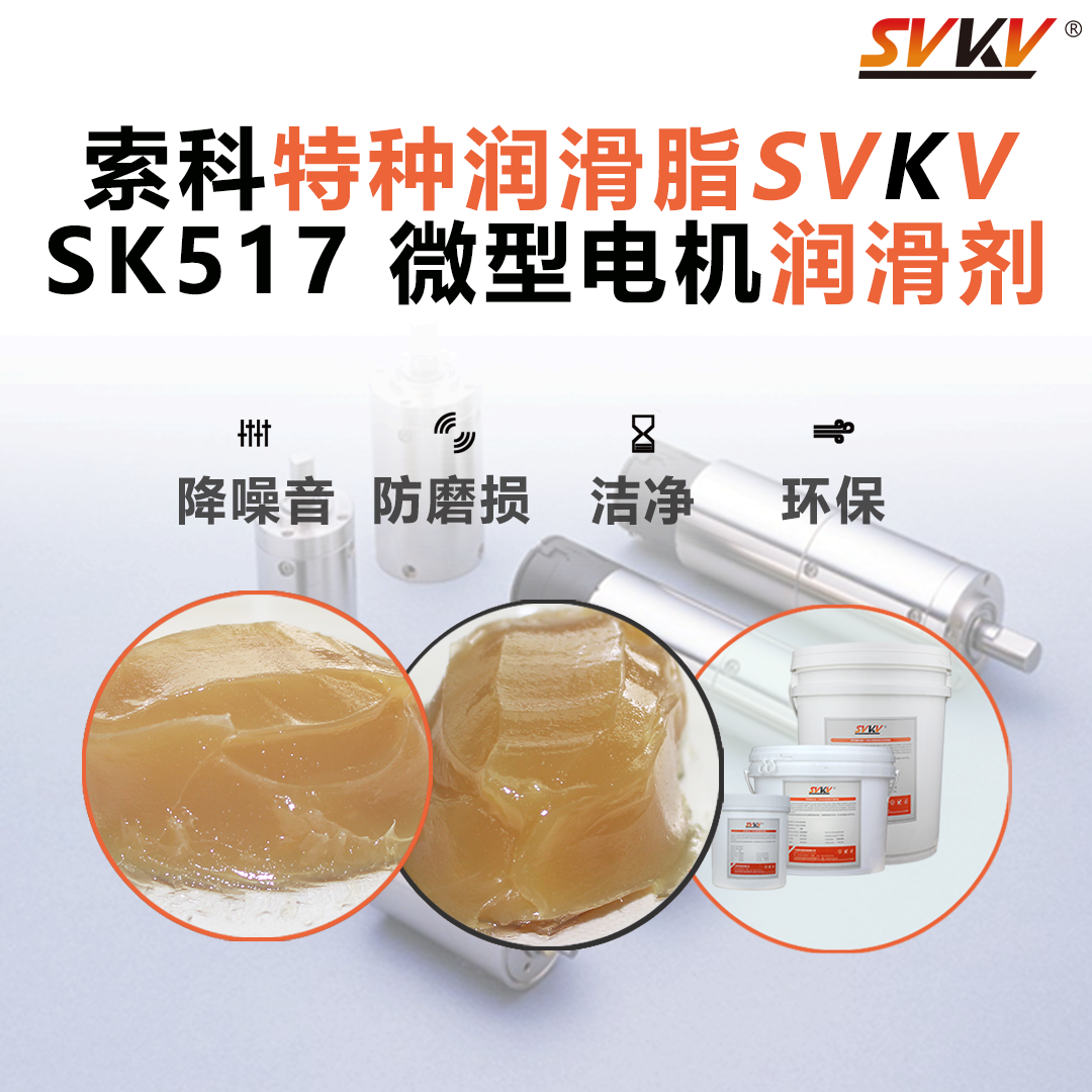 推薦索科SVKV SK517系列微型電機潤滑脂。減少電機中齒輪磨損,降低噪音,達到長壽命和防水的效果。適用中低轉(zhuǎn)速的齒輪、軸承,塑膠/塑膠、金屬/塑膠的潤滑、消音、降電流等效果。